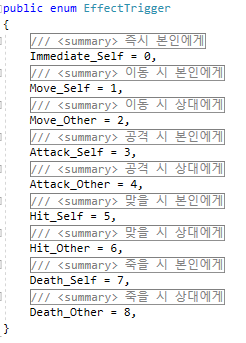 그리고 스킬을 넣기 전 어떤 상황에 어떤 상태를 만들지 정하기 위해 각 트리거를 enum으로 나누고 시작했다.